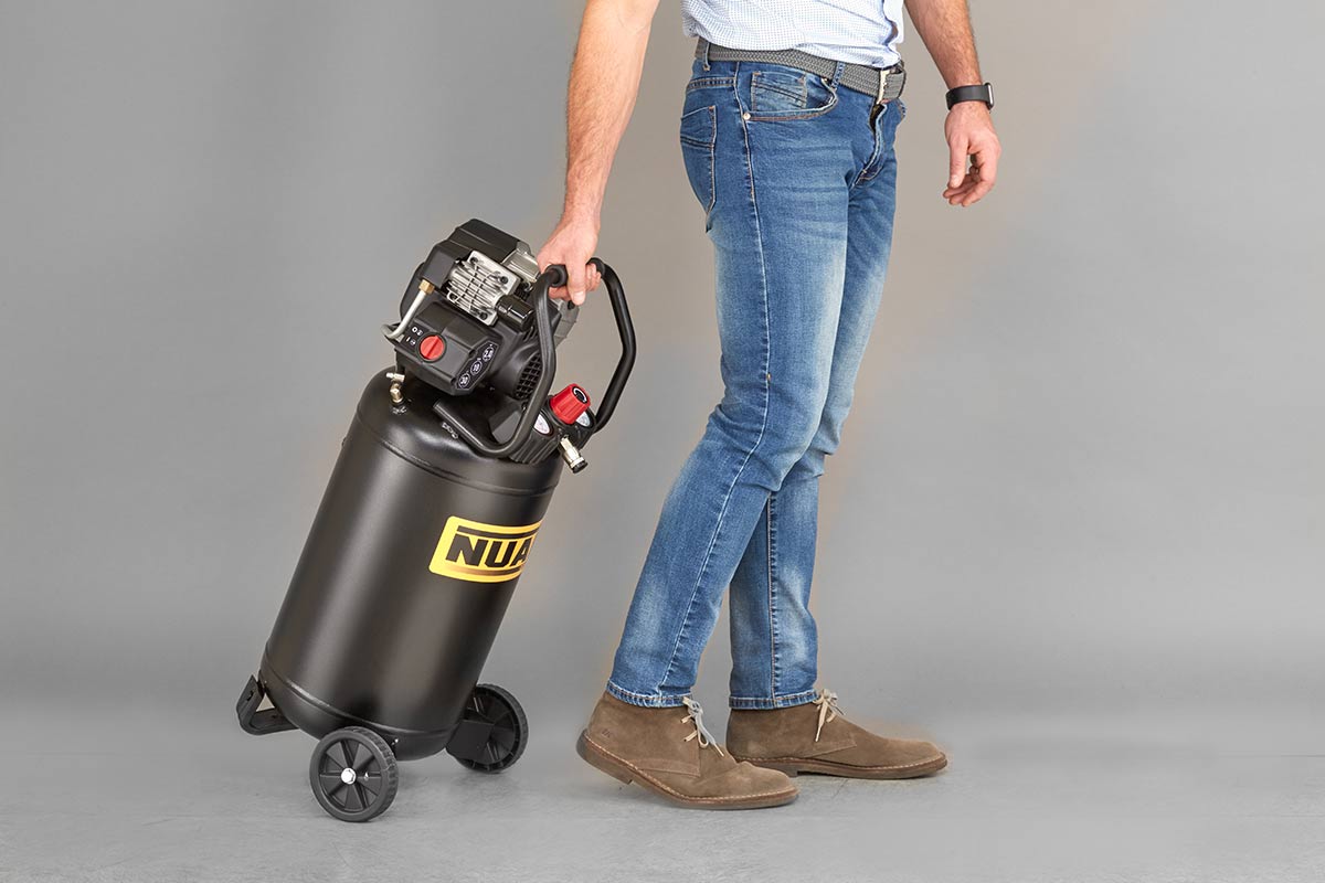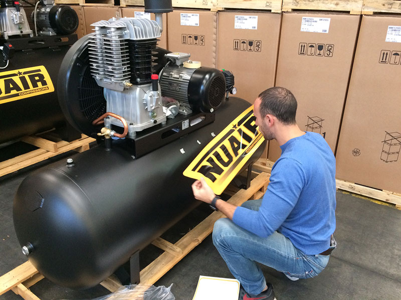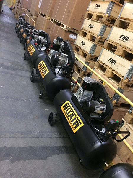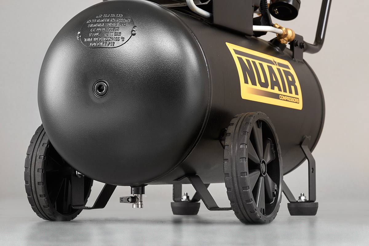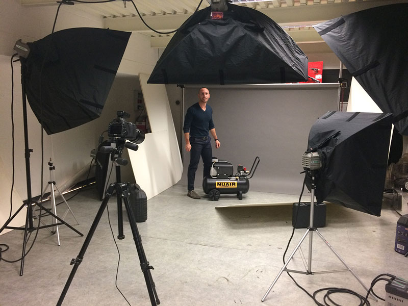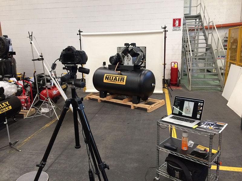 Siamo alla Fna Compressors e questo servizio è stato realizzato nel novembre del 2017. Dovevamo realizzate tutte le imagini per il nuovo catalogo della linea NUAIR. Essendo il prodotto nero e dovendolo poi scontornare in fase di impaginazione. Ho deciso di realizzare le riprese su un fondo grigio medio in modo che il riflesso del fondo sui serbatoi non fosse né troppo marcato come un fondo bianco, né troppo “nero-bucato” come se fosse su un fondo nero.